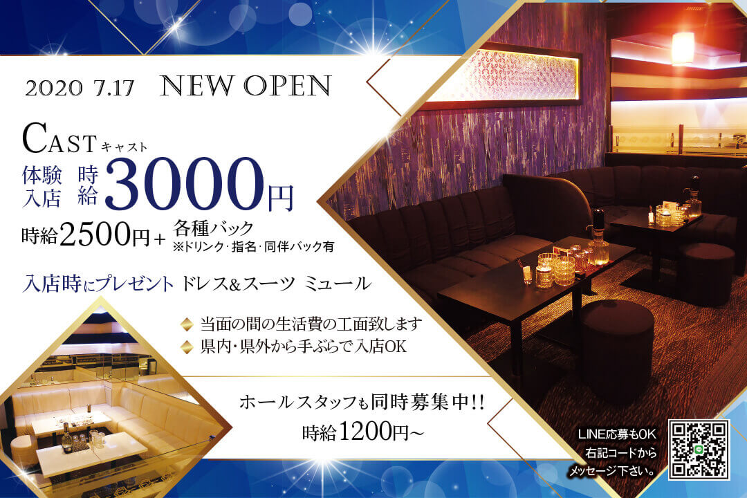 【体験入店】 最大時給6000円〔期間限定〕 ●当日現金で全額支給。 ○体験入店は一度ではなく複数回OK。 【在籍後】 時給2500円~3000円+ 各種高額バック有 ●同伴・指名バック100%、 ボトルキープバック30%、 その他月〆賞与有 《完全歩合制度》 時給や高額バックに加え、 完全歩合制も導入しています◎ 選択制を採用しているため、 「自分の力でどんどん稼ぎたい」と 考えている方には最適なシステムです! 【月収例】 ≪会社上がりに働くAさん/会社員≫ 時給2500円×1日3h×週2~3日〔月8日〕 =月収6万円+各種バック ≪しっかり稼ぎたいBさん/フリーター≫ 時給2500円×1日5h×週5日〔月20日〕 =月収25万円+各種バック |